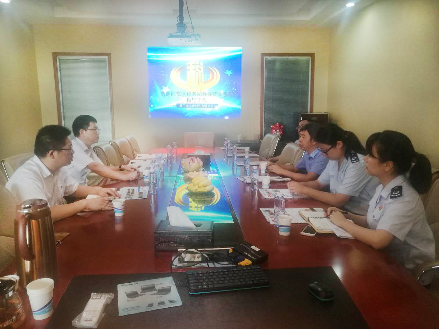 9月17日,同安區稅務局副局長葉東海一行五人蒞臨我司指導工作,我司總經理張德富及財務主管黎秀華接待并在二樓會議室召開了座談會。